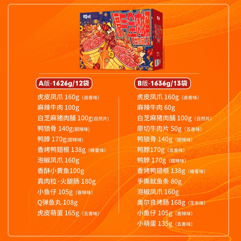 • 百草味 纯肉零食大礼包1626g12袋/1636g13袋 鸭脖猪肉脯牛肉干休闲小吃年货礼盒礼物送女友送礼( 随机发)